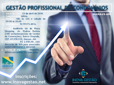 No Curso de Gestão Profissional de Condomínios são apresentadas muitas situações do dia a dia, incluindo as atribuições de um síndico, legislações pertinentes, checklists de manutenção, relacionamento com os condôminos, com os empregados, com a administradoras de condomínios, prestadores de serviço e também como compor seus honorários e definição de carga horárias para cada condomínio, além de convocação e condução de assembleias. Curso presencial com apostila digital.